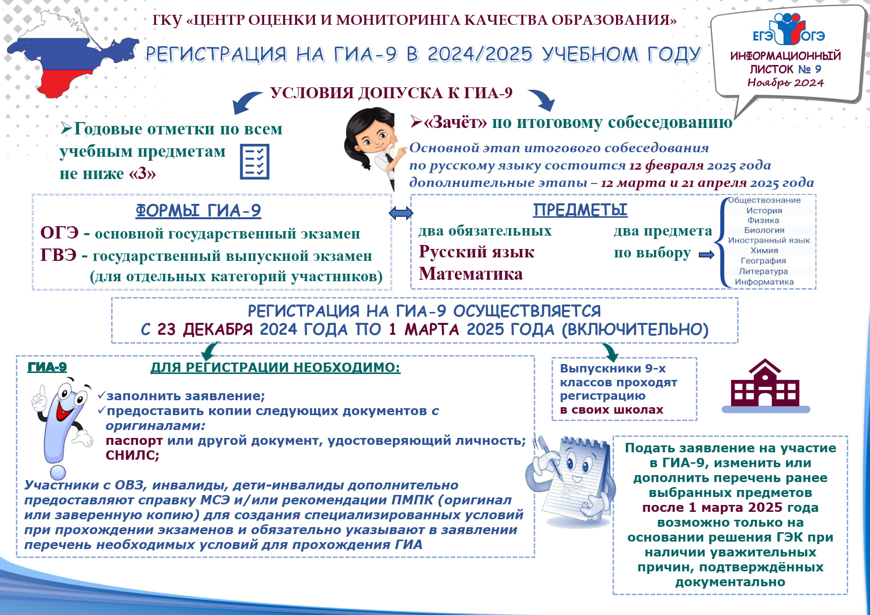 К ГИА-9 допускаются обучающиеся, не имеющие академической задолженности и в полном объеме выполнившие учебный план или индивидуальный учебный план (имеющие годовые отметки по всем учебным предметам учебного плана за 9 класс не ниже удовлетворительных) и успешно сдавшие итоговое собеседование по русскому языку.