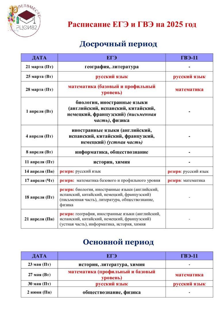 Для проведения ЕГЭ на территории Российской Федерации и за ее пределами предусматривается единое расписание экзаменов.